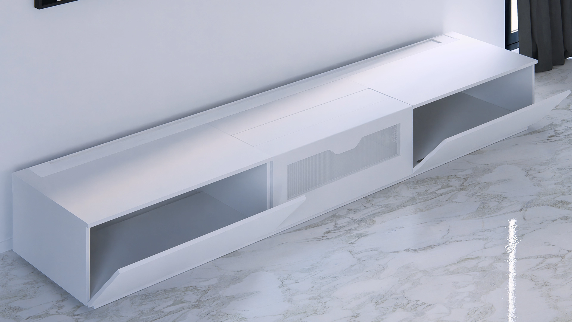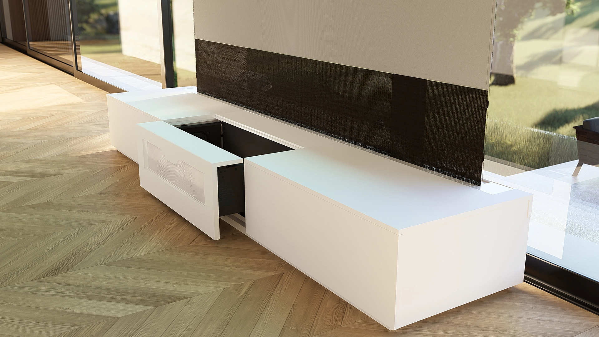 ✅ Avec son système motorisé, vous pouvez passer votre meuble RISE en positon "fermé" en 1 seul clic, pour profiter de votre vue quand vous ne l'utilisez pas.