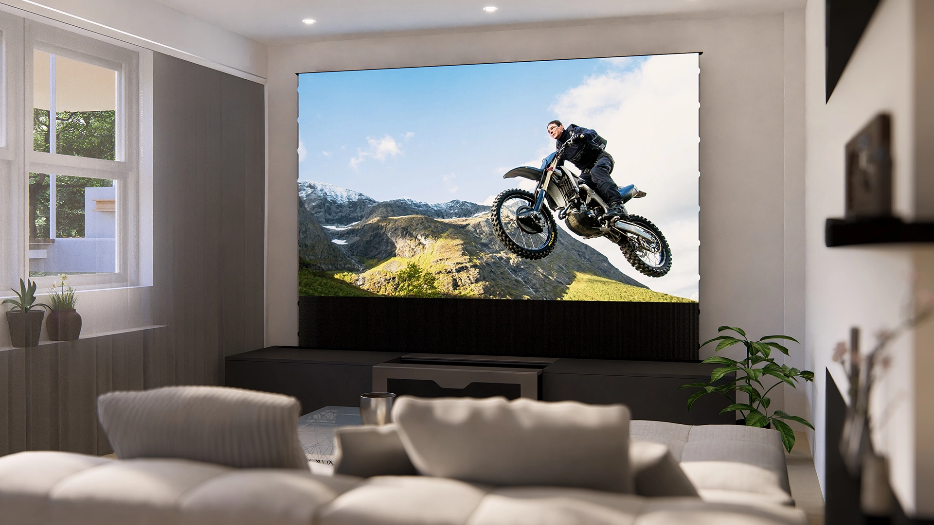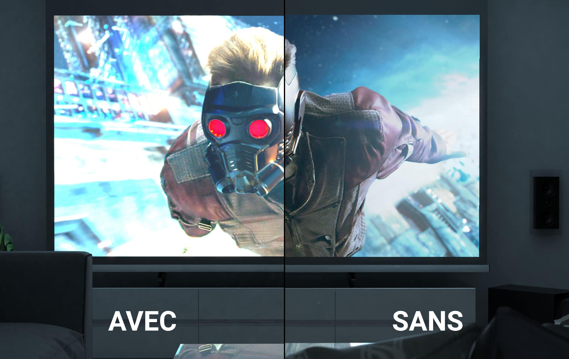 Bonus : Sa toile ALR capte la lumière ambiante pour vous offrir une projection immersive, sans reflet parasite. En lumière allumée ou éteinte. De quoi profiter d’une image sans réflexions de lumière, même dans les pièces à forte luminosité.