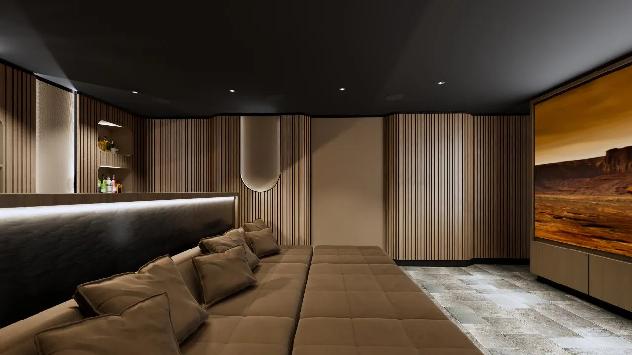 Un espace multimédia chaleureux, acoustiquement traité. Ambiance feutrée, tons beige et bois, confort absolu. Le juste milieu entre salon et cinéma.