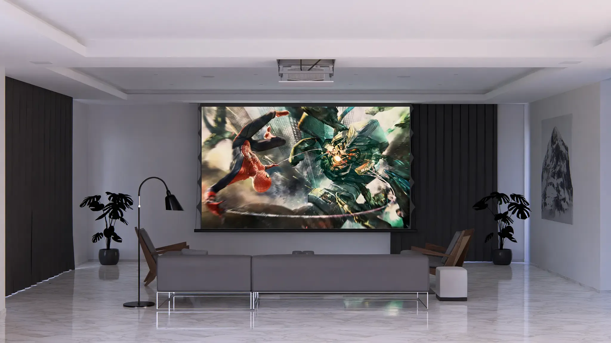 Un cinéma totalement intégré dans votre salon. Enceintes invisibles, écran motorisé, vidéoprojecteur discret. L'expérience cinéma sans compromis sur votre décoration.