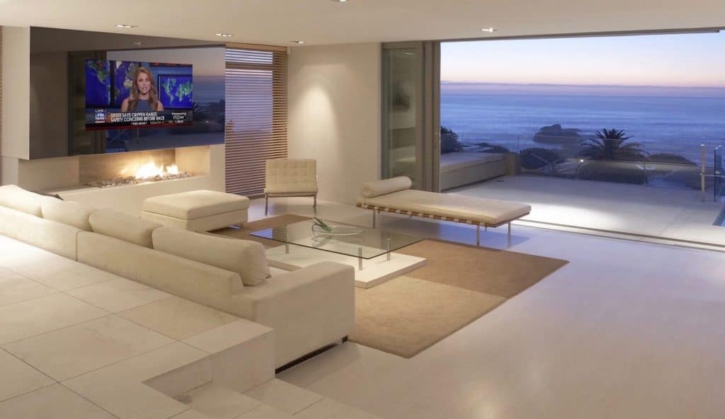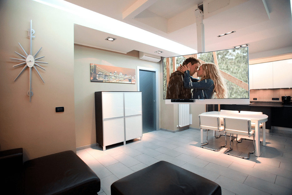 Faire disparaître sa TV dans le plafond est une super solution notamment lorsque celle-ci se trouve au centre d’une pièce. Les lifts pour écrans plats restent néanmoins assez chers (comptez au moins 4000€ pour le support motorisé et l’installation – sans TV). Attention toutefois : l’ascenseur pour écran plat au plafond préserve votre déco, mais reste toujours un peu visible lorsqu’il est rétracté. Cette solution est donc plutôt recommandée pour les intérieurs vastes dans lesquels les murs ne permettent pas d’accueillir un écran plat.