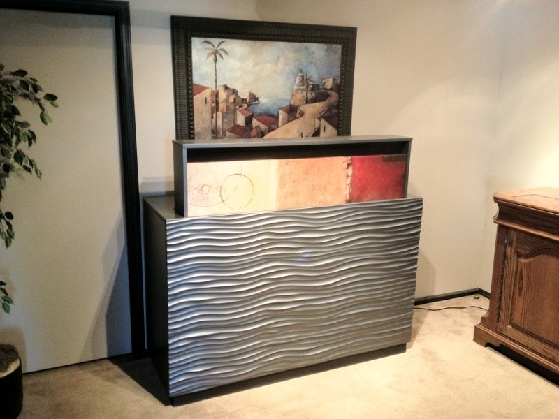 Faire disparaître sa TV dans un meuble est une solution à la fois pratique et esthétique. Ici, votre TV est dissimulée au coeur d’un meuble qui permet simultanément d’y ranger les différents appareils électroniques. Encore très chères il y a quelques années, ces solutions sont devenues plus abordables. Le site MobilierMoss propose par exemple un élément complet (ascenseur et meuble compris) à moins de 1500€. L’avantage d’une télé qui s’escamote dans un meuble est aussi que votre mur reste ainsi libre d’accueillir la décoration que vous souhaitez. Le choix réduit de design ne permet néanmoins pas une adaptation à tous les intérieurs.