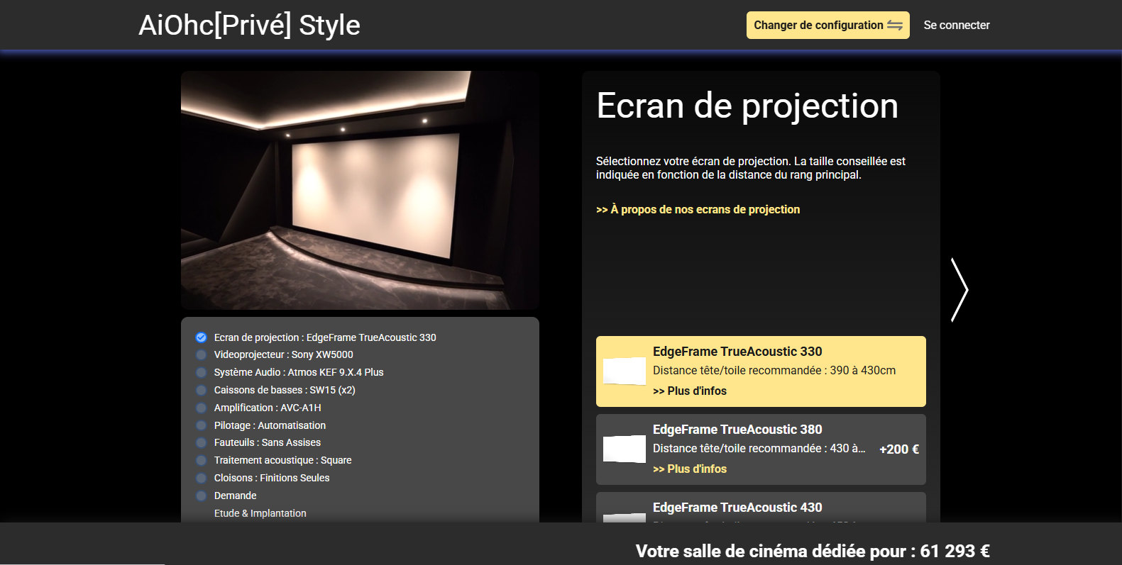 Le configurateur AiOhc que nous avons développé en interne vous permet de réaliser la première configuration de votre future salle de cinéma, en autonomie. Tous les prix sont affichés. 100% transparence. Aucune surprise.